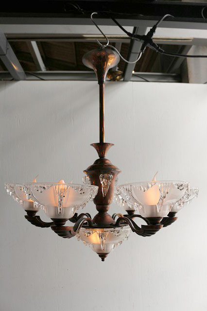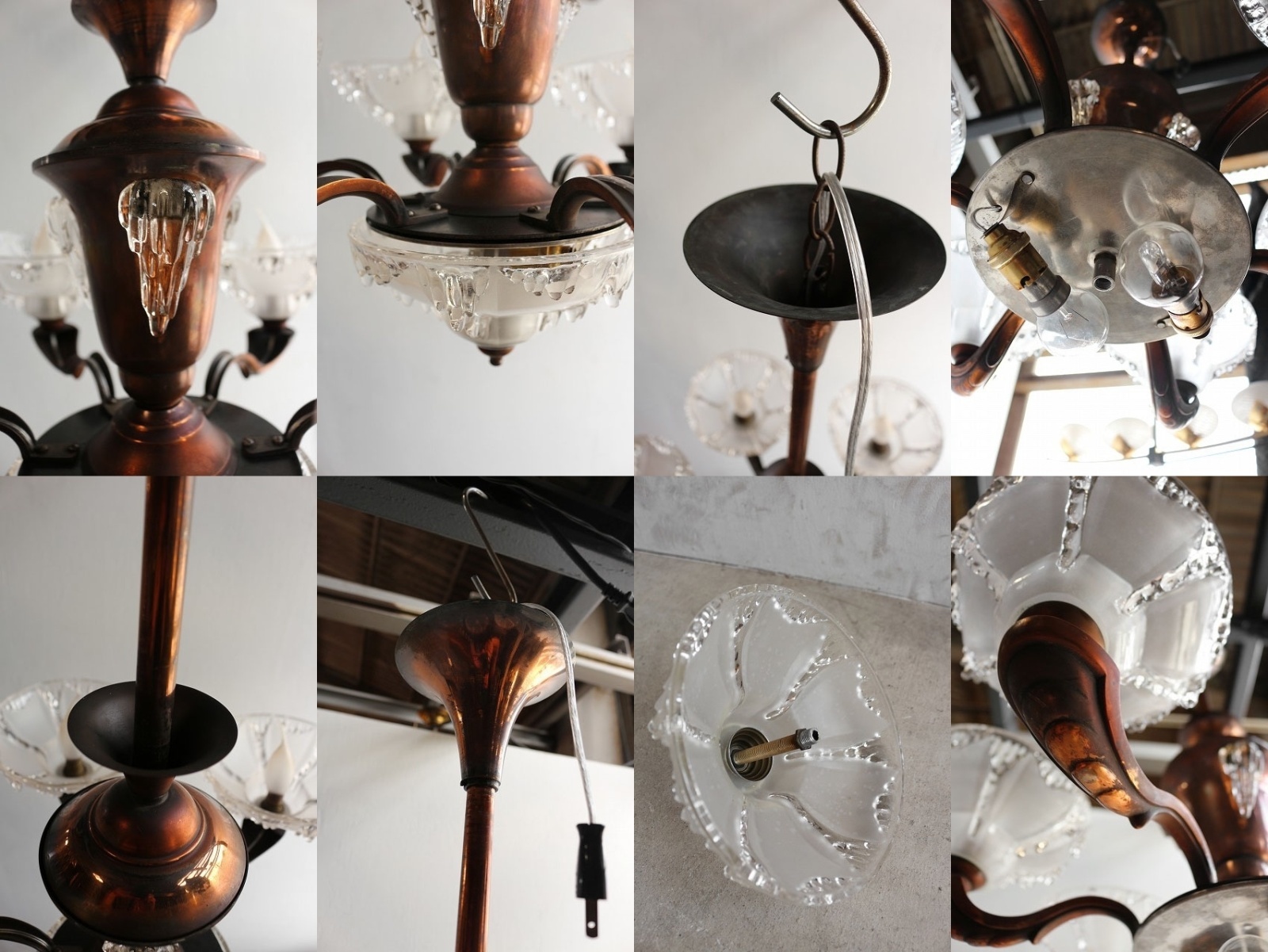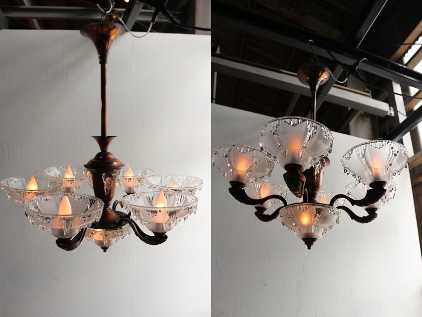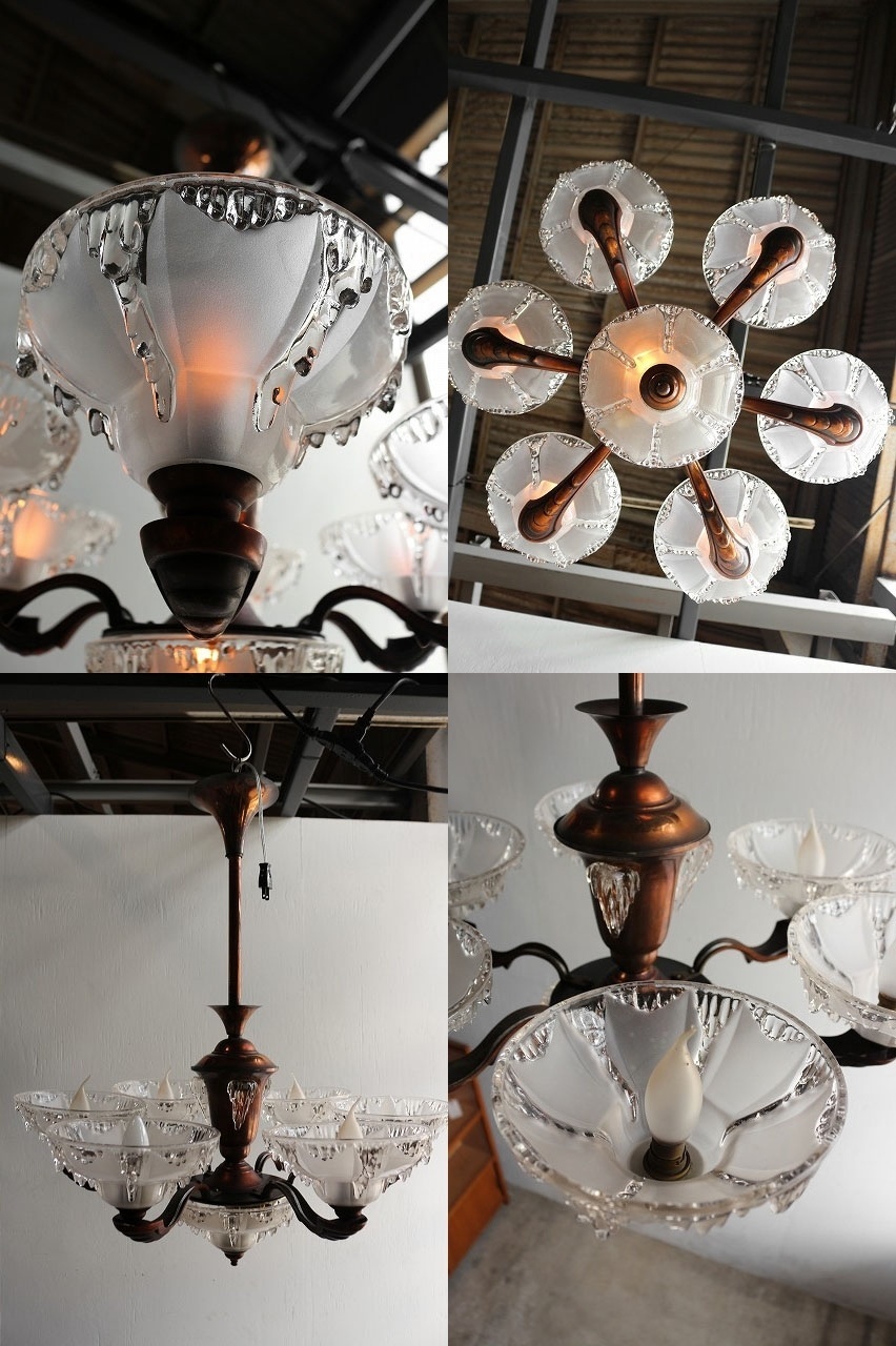アンティーク EZANガラスシェード アールデコ8灯吊り下げランプ