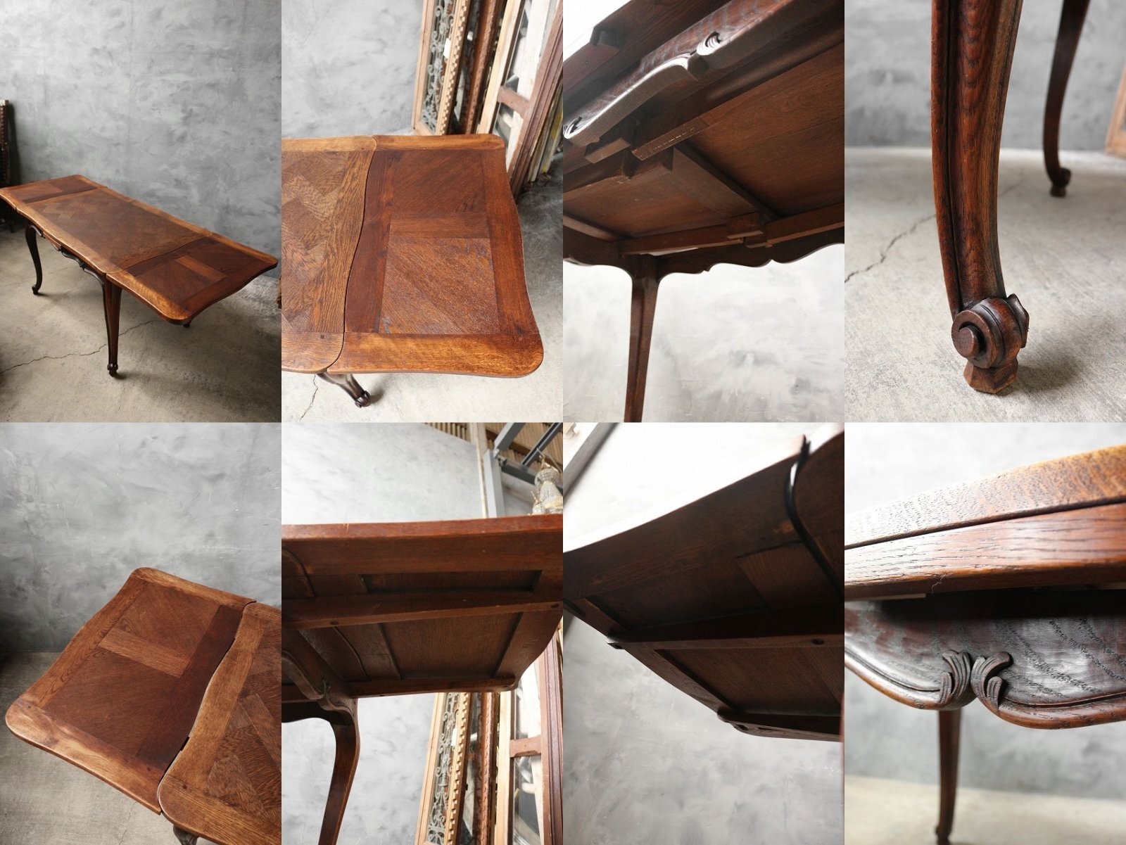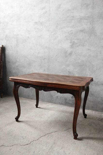 フランスで買い付けましたアンティークのモザイク模様 ドローリーフテーブルです。フランスならではのモザイク天板に猫脚ベースが非常におしゃれなテーブルです。天板下に延長板があり引くだけで伸縮が出来るのも大変魅力です。経年による木質の風合いも最高です。しお部屋やショップ等の実用兼ディスプレイ什器としておすすめです。状態ですが、経年による木質劣化、木かけや木割れ、汚れ、歪み、小傷や擦れ、打痕跡、補修箇所等の使用感はございますが雰囲気を損ねるような目立つダメージもなくアンティークならではの良い状態かと思います。ただあくまでアンティークになりますのでご理解いただける方のご購入をよろしくお願いします。