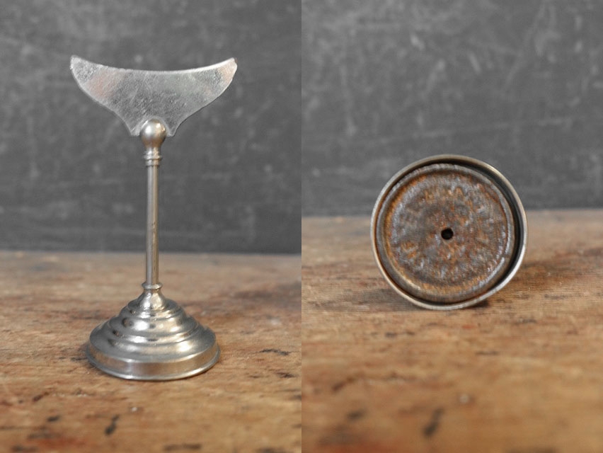 フランスで買い付けましたアンティークのSIEGEL PARIS shoes standです。もともとはショップのショーウィンドウに靴を飾るのに使用されていたものですが、イヤリングや指輪などジュエリーを飾るのにも最適です。SIEGEL社は、1800年代後半からパリで店舗用什器を制作していた老舗の会社です。特に1900年代初頭からは、世界最高峰のマネキンメーカーであるSTOCKMANと提携し、ディスプレイ関連の什器製作などで知られていました。お部屋やショップ等の実用兼ディスプレイとしておすすめです。状態ですが、錆等の金属特有の劣化、小傷や汚れ、若干の歪み等の使用感はありますが雰囲気を損なうようなダメージもなく問題ない状態かと思います。ただあくまでアンティークになりますのでご理解いただける方のご購入をよろしくお願いします。