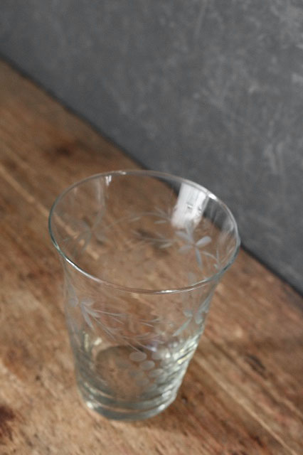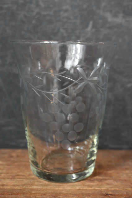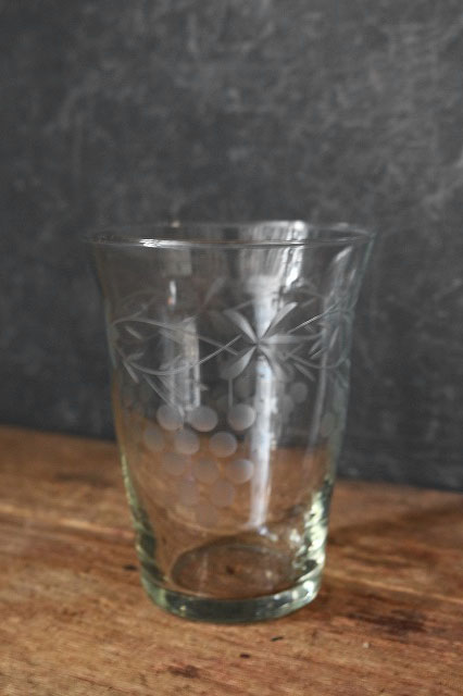 フランスで買い付けたアンティークのグラスです。葡萄模様がエッチング加工されており、とても雰囲気のいいグラスです。お部屋やショップ等のディスプレイとしておすすめです。状態ですが、小傷や汚れ等の使用感はありますが雰囲気を損ねるような目立つダメージもなく問題ない状態かと思います。ただあくまでアンティークになりますのでご理解いただける方のご購入をお願いします。
